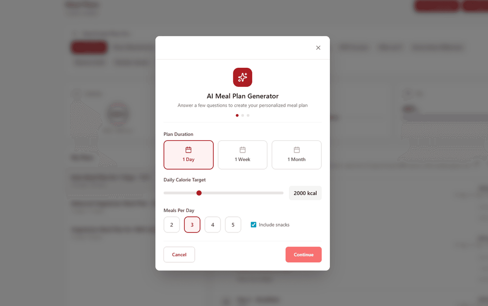 Whether you need a one-day plan, a full week, or an entire month, the AI quickly builds structured meal plans that fit different diets, allergies, and lifestyles. Every plan is fully editable, so you stay in control.